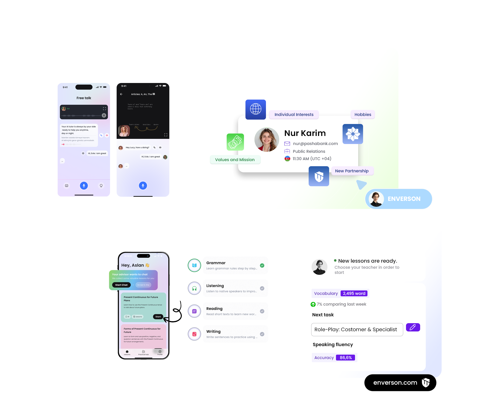 Speaking tasks in real-life roles tailored to the user's goals and position.